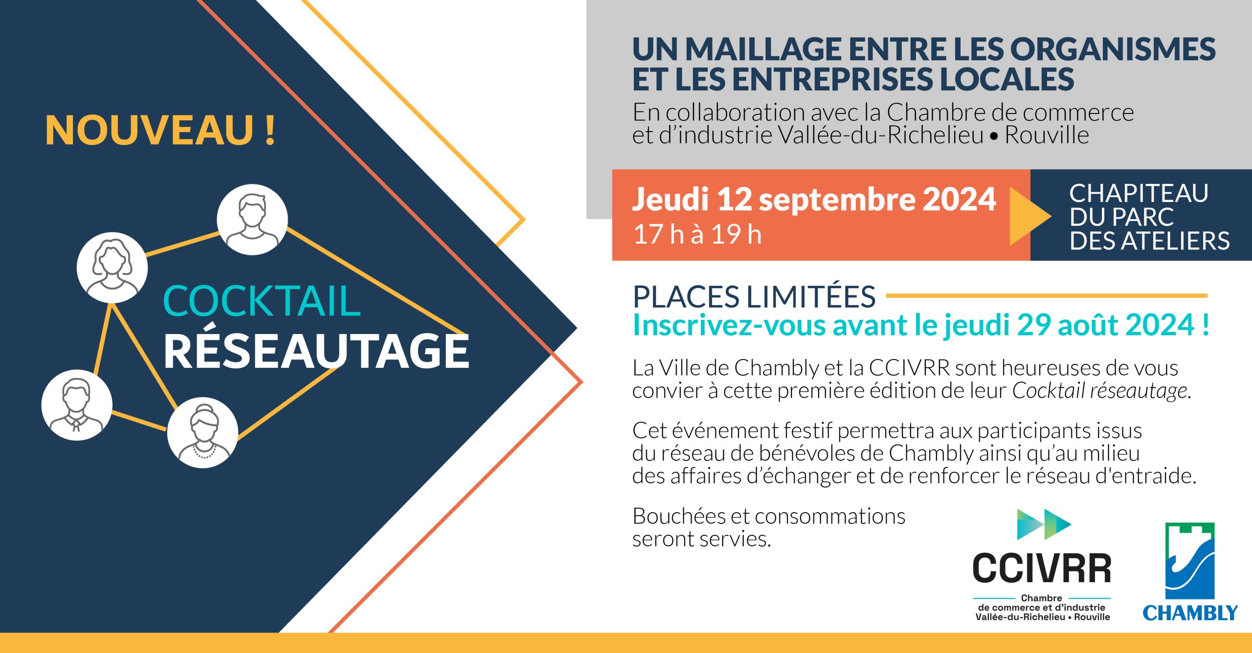 La Chambre de commerce et d’industrie Vallée-du-Richelieu – Rouville et la ville de Chambly s’associent pour la première édition du Cocktail réseautage.