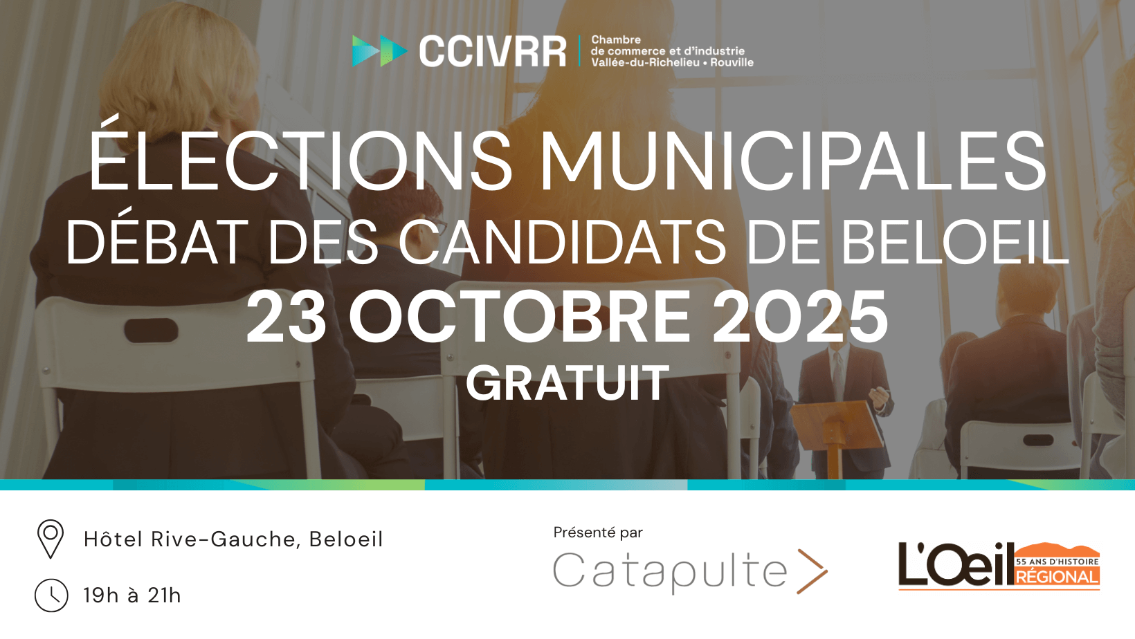 La Chambre de commerce et d’industrie Vallée-du-Richelieu – Rouville, en collaboration avec Catapulte communication et L’Oeil Régional, est fière d’organiser un débat réunissant les candidates et candidats à la mairie de Beloeil.